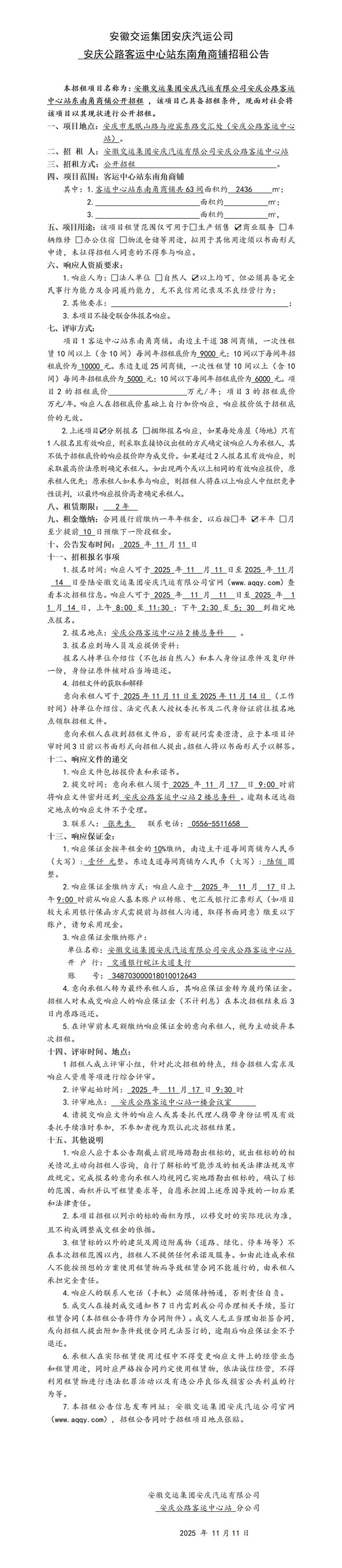 安慶公路客運(yùn)中心站東南角商鋪招租公告