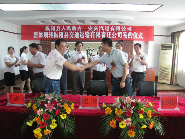 上午10時(shí)18分,隨著喜慶、歡快的樂曲響起,在省公司副總經(jīng)理方詩(shī)喬,樅陽(yáng)縣長(zhǎng)何謙、交通局長(zhǎng)胡長(zhǎng)友,安慶汽運(yùn)公司書記徐軍、副總經(jīng)理彭宏的共同見證下,樅陽(yáng)縣副縣長(zhǎng)胡海峰、安慶汽運(yùn)公司董事長(zhǎng)張進(jìn)、縣公司經(jīng)理童子健代表各方在整體劃轉(zhuǎn)協(xié)議書上簽字。簽約儀式在熱烈的掌聲中圓滿落幕。