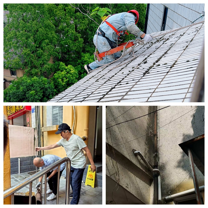 8月安全巡查期間,綜合服務(wù)中心安全科針對(duì)紡織南路7號(hào)樓及周邊區(qū)域開展專項(xiàng)隱患排查,發(fā)現(xiàn)兩處亟待處理的安全問題:一是7號(hào)樓公廁外側(cè)落水管多處破裂,導(dǎo)致雨水滲漏至路面并形成大面積積水,不僅影響市容環(huán)境,更對(duì)過往車輛及行人構(gòu)成潛在風(fēng)險(xiǎn);二是慶達(dá)綜合樓頂層臨街面瓷磚多處開裂,縫隙中滋生的灌木根系已侵入建筑結(jié)構(gòu),存在高空墜物隱患,嚴(yán)重威脅公共安全。
